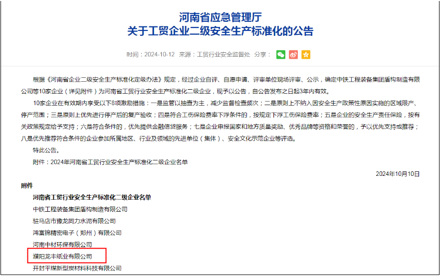 10月10日,從河南省應(yīng)急廳傳來喜訊,公司被授予省安全生產(chǎn)標(biāo)準(zhǔn)化二級企業(yè)稱號。